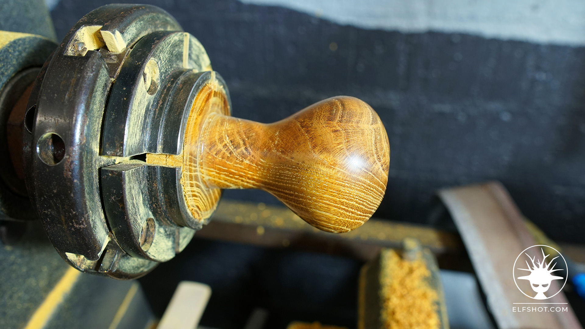 - Take the piece out, turn it around and rechuck at the lathe headstock end. Now the handle shape can be turned using a small bowl gouge or spindle gouge.